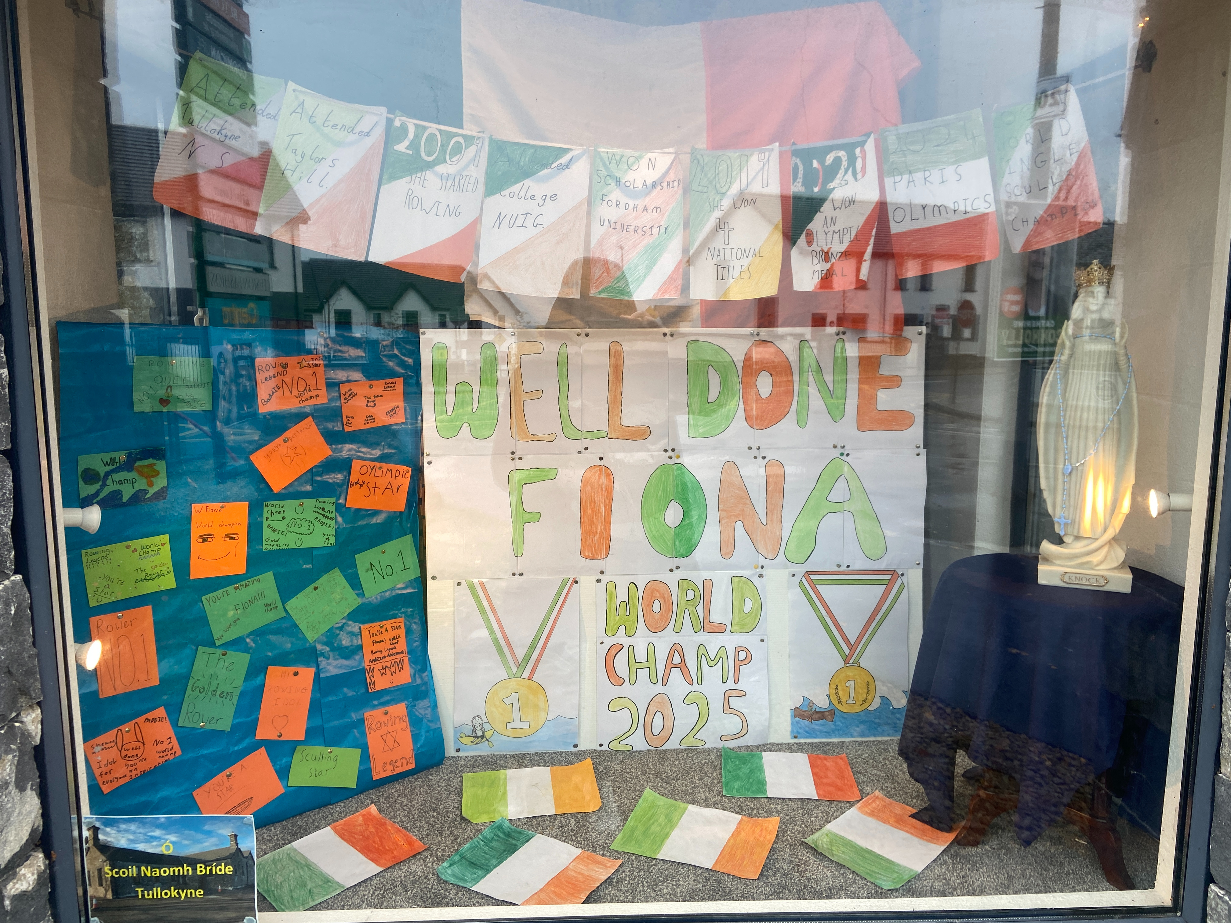 Our school is very proud to say that Fiona Murtagh is our past pupil. She won a bronze medal in the 2020 Tokyo Olympics and recently won a gold medal in the World Rowing Championships in Shanghai, which we were extremely happy to hear! As a celebration of her win, the senior room decided to make a poster congratulating her. The whole classroom chipped in by colouring, drawing and organising it. It is hung up in the cillín in Moycullen. The Rang 6 girls spent a lot of time putting it together. We are so proud of Fiona Murtagh!